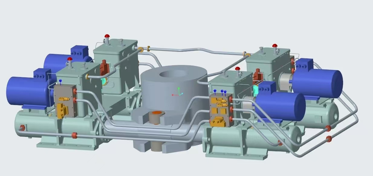 17000TEU雙燃料集裝箱船是綠色新能源船舶的典型代表,武漢船機為該船提供的舵機型號為FE42-1150-T050,最大工作扭矩可達(dá)11280kN·m,最大轉(zhuǎn)舵角度為37度,單臺舵機配備的四套動力系統(tǒng)為雙柱塞四油缸拔叉式舵機結(jié)構(gòu),具有系統(tǒng)性集成度高、可靠性高、性能優(yōu)等特點。